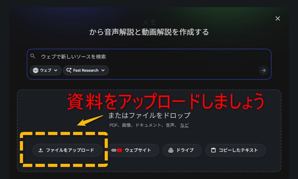 次にダウンロードした資料をGoogle NotebookLMにアップロードしましょう。