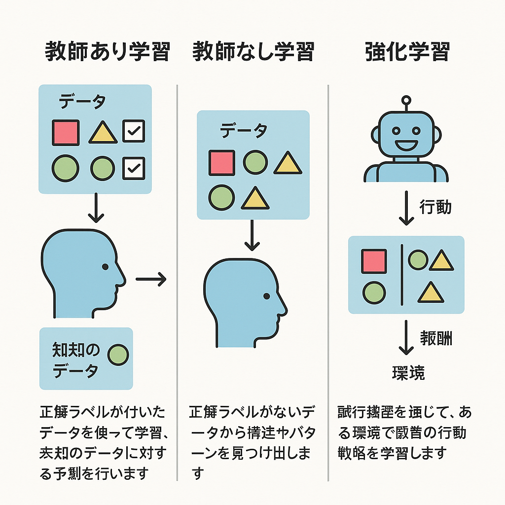 機械学習にはいくつかの主要なアプローチがあります。
