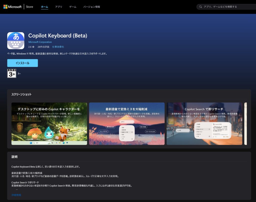 表示された「Copilot Keyboard」アプリのページを開きます。アプリ名や提供元(Microsoft)が正式なものか確認してから、「インストール」ボタンをクリックします。