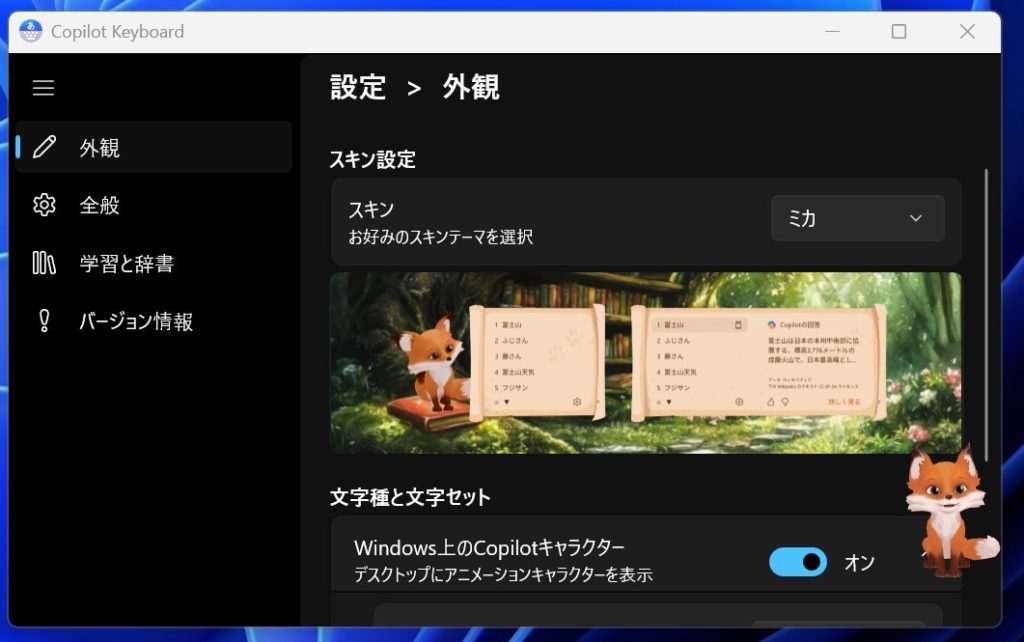 テーマスキンは4つ用意されており、キツネの「ミカ」、キノコの「ミリン」、水滴の「アクア」、そしてCopilotの「既定」です。