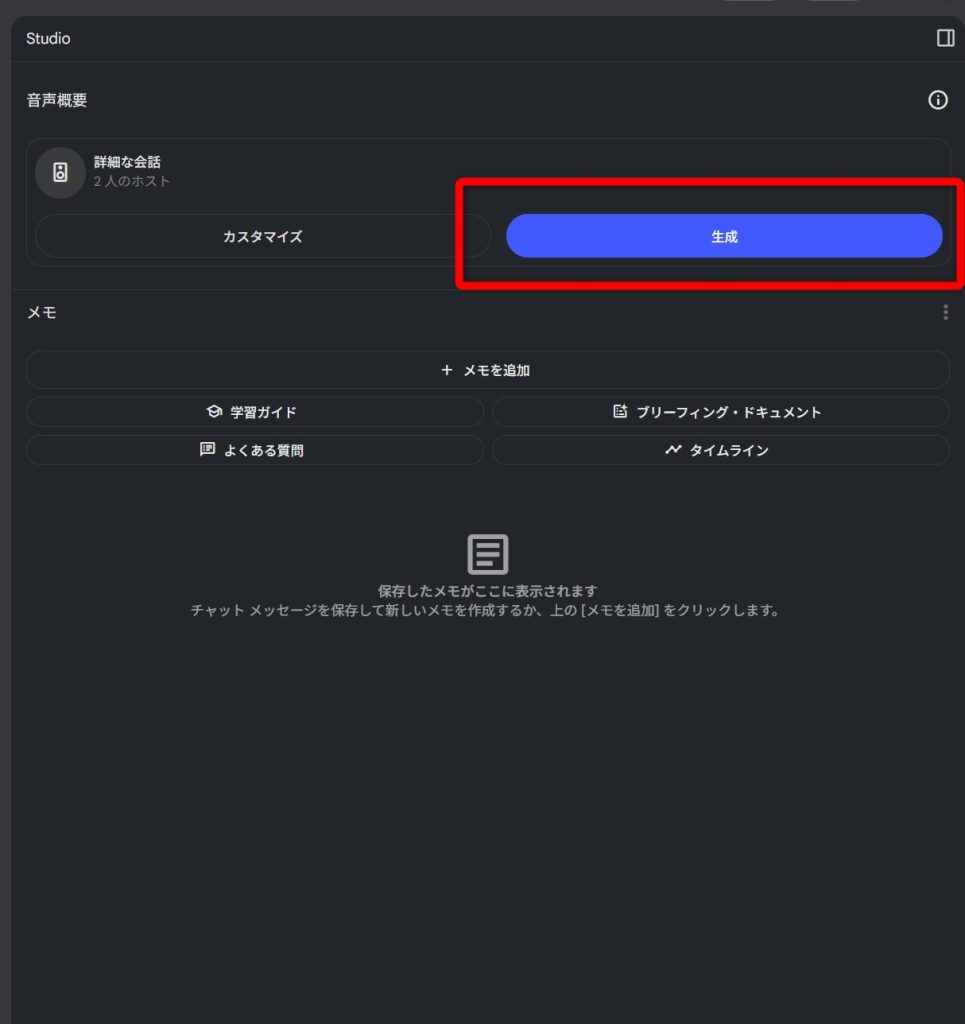 では、実際にNotebookLMのAIポッドキャストを生成してみました。