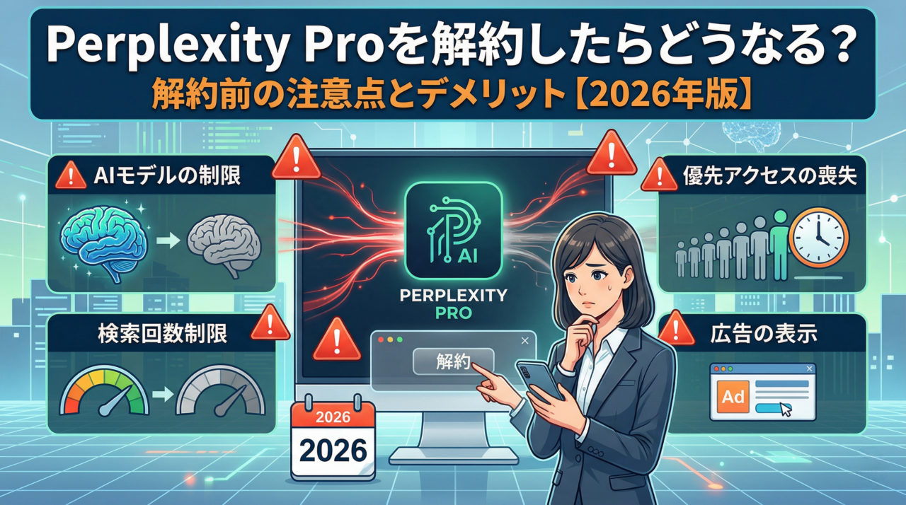 Perplexity Proを解約しても、現在の請求期間終了日まで使い続けられます。注意すべきは「スマホアプリから解約できない」「アカウント削除しても解約にならない」という2点です。ソフトバンク・Y!mobile経由で契約した方はキャリア側からの解約が必要です。